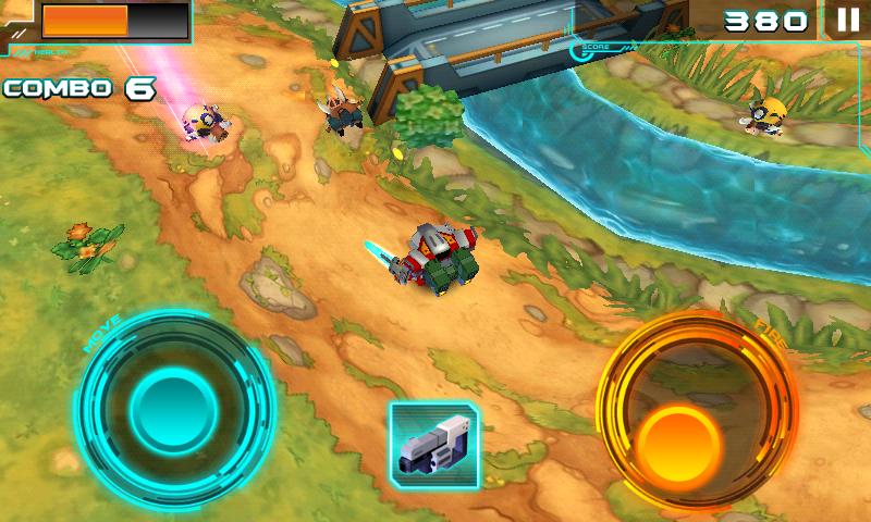 Armorslays utilizes a fast and easy to use digital joystick navigation. It allows you to use two fingers at once: One for movement, the other to shoot your gun or pull your sword. The more enemies that die, the more money you will earn. But be sure to invest it wisely. Spend your hard-earned cash on a new robot look or perhaps more powerful weapons or even special boosts which will make you stronger that give you a boost for land, sea or sky battles.